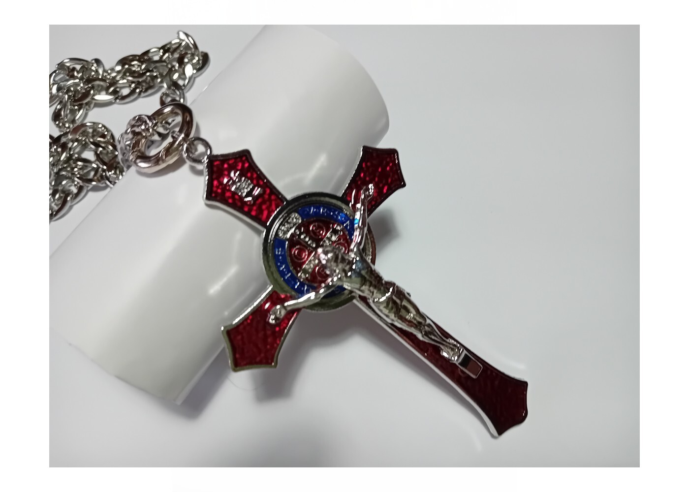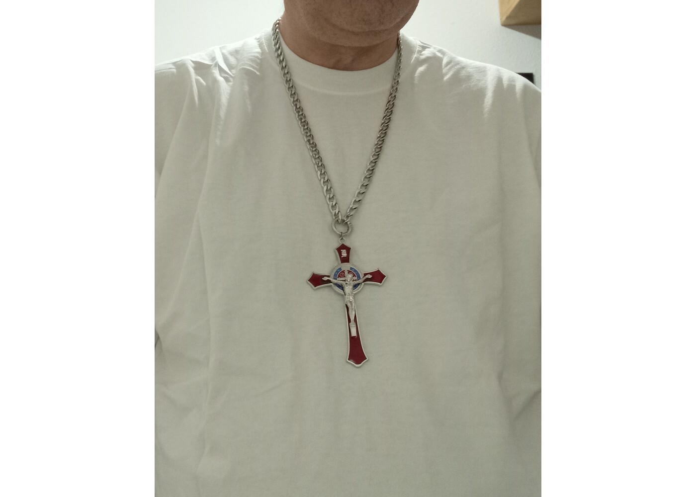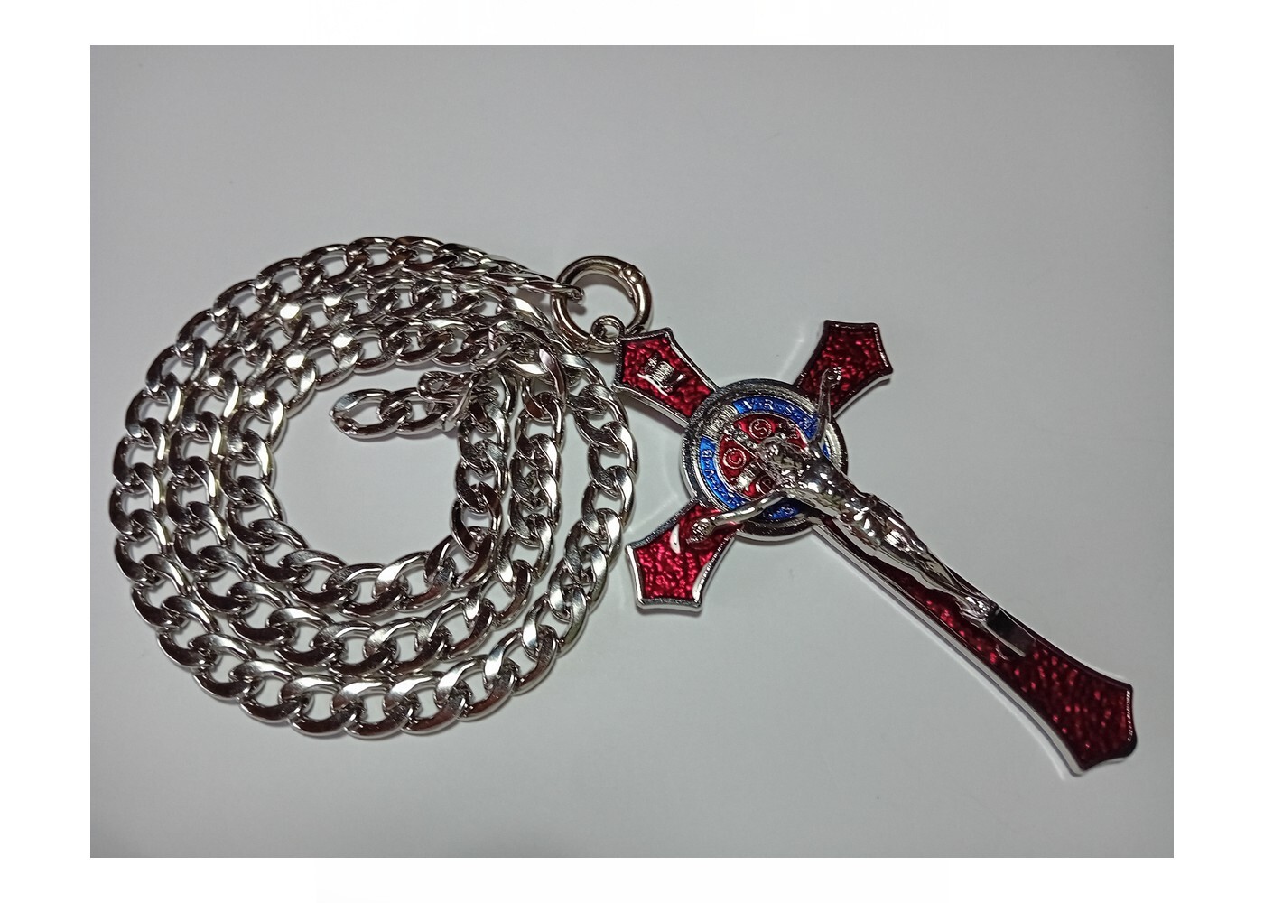 Edelstahl Halskette mit 12cm Kreuz Rot-Silber