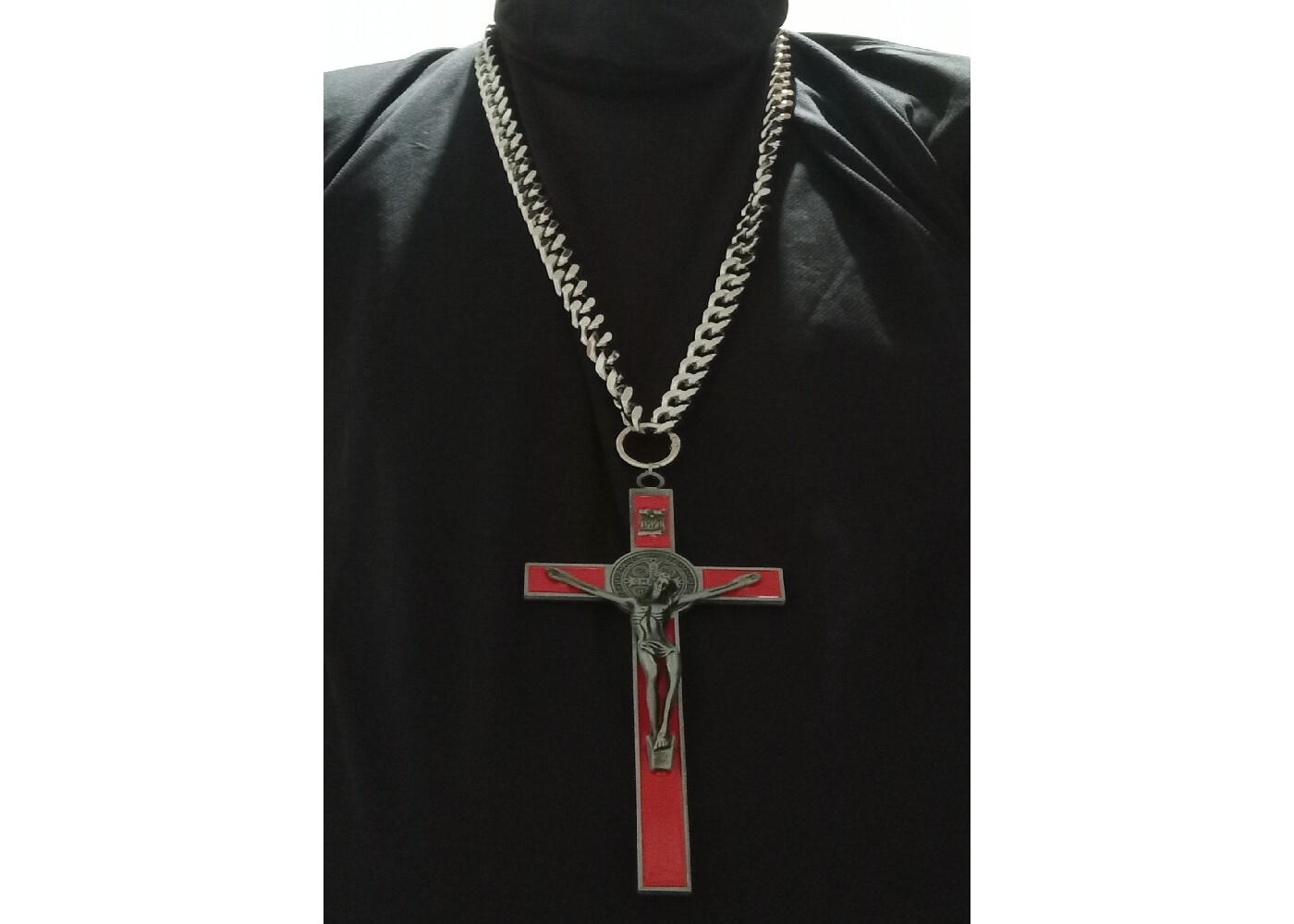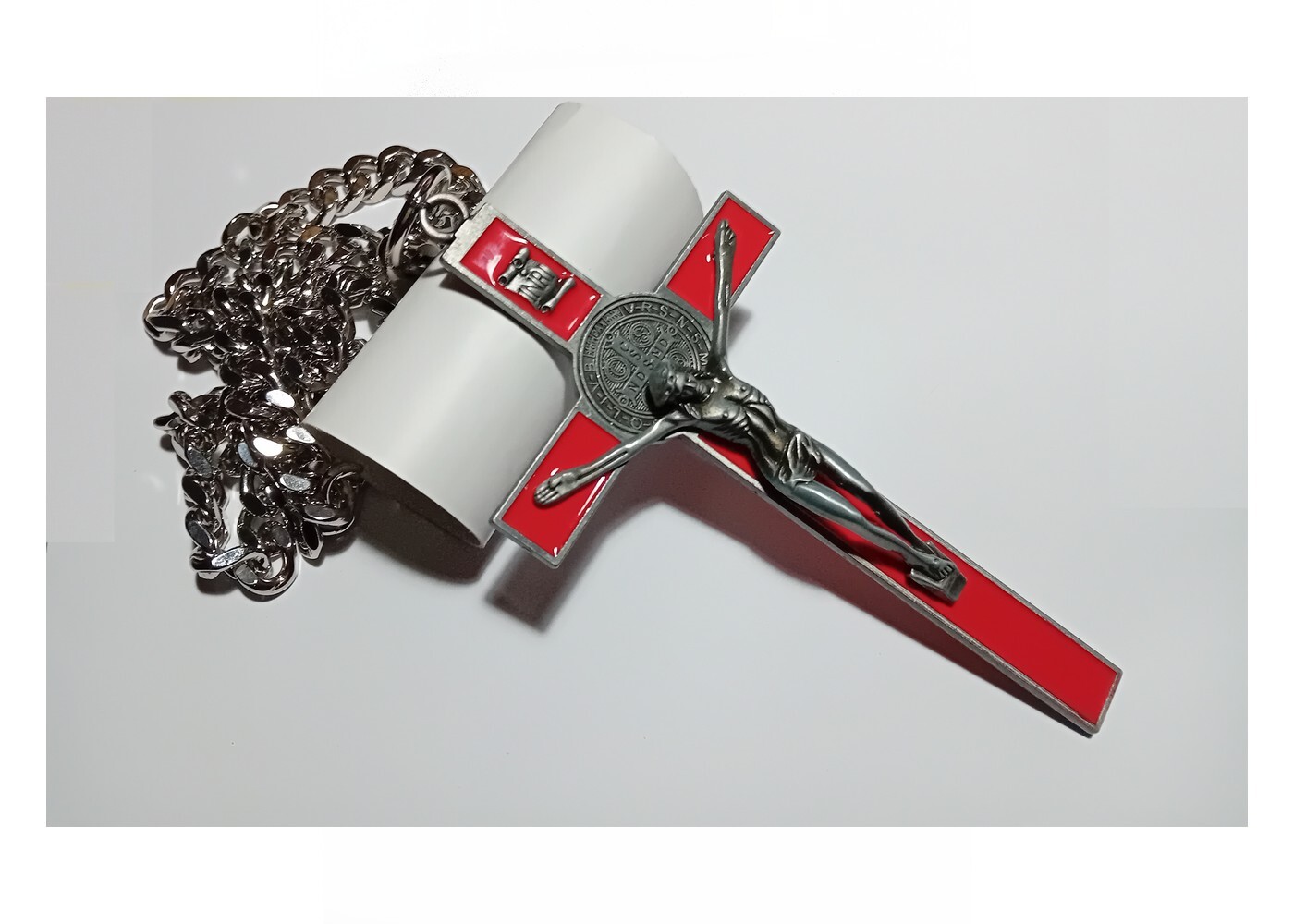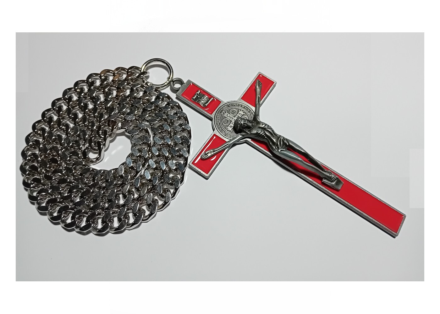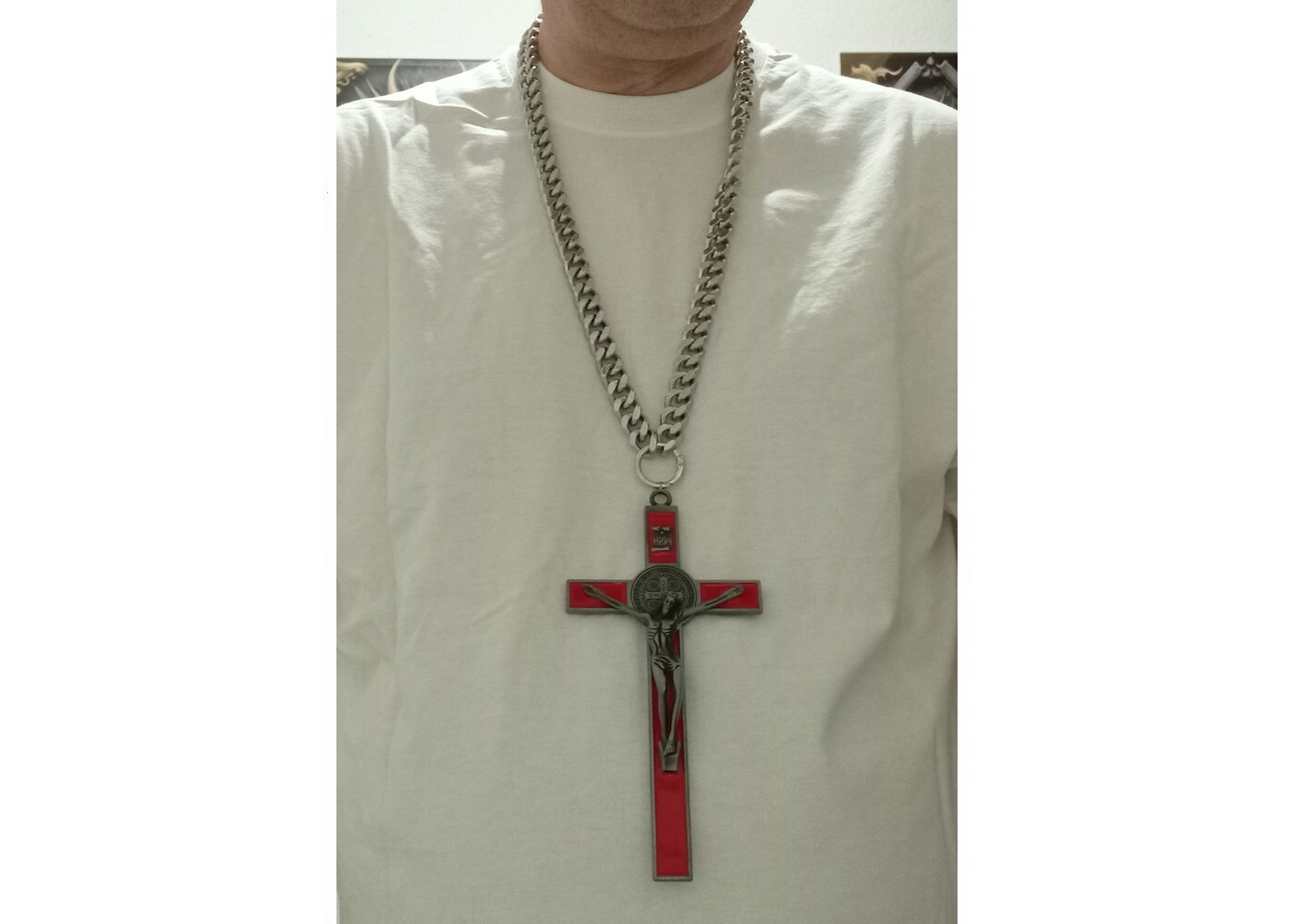 Sehr breite und lange Edelstahl Halskette mit einen sehr großen Kreuz mit roter Emaille (Bitte die Bilder anschauen) zusätzlich gibt es noch ein Armband in 20cm Länge plus O-Feder-Ringe dazu. Ersatz-Verschlüsse sind natürlich auch dabei.