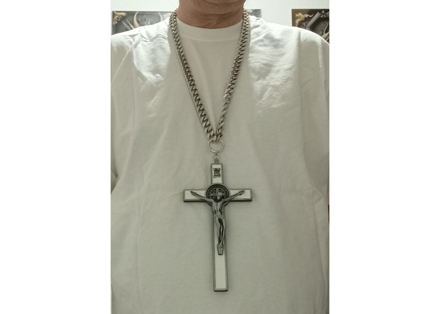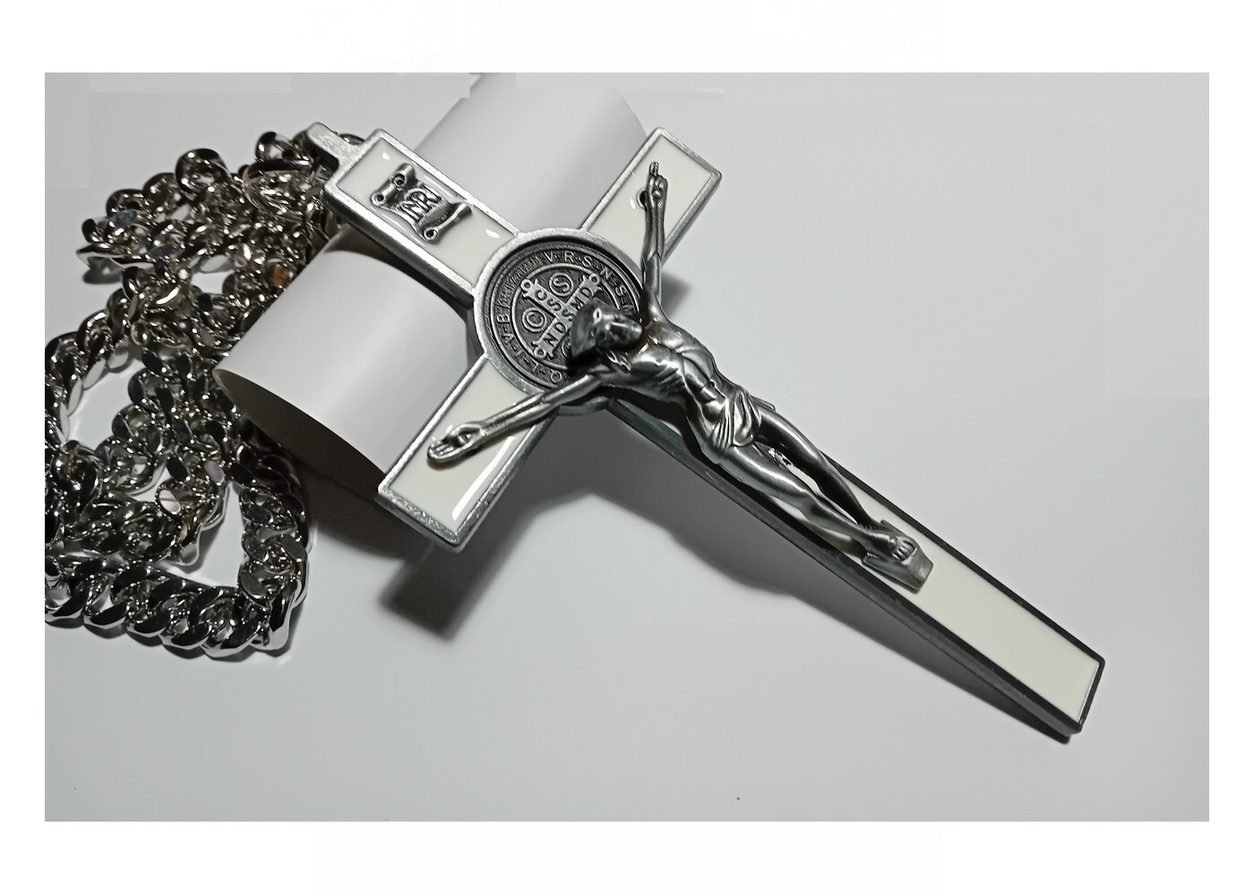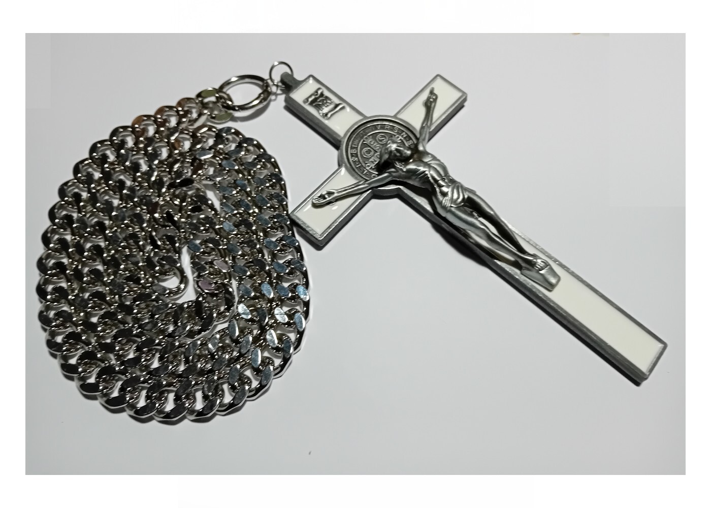 Sehr breite und lange Edelstahl Halskette mit einen sehr großen Kreuz mit weisser Emaille (Bitte die Bilder anschauen) zusätzlich gibt es noch ein Armband in 20cm Länge plus O-Feder-Ringe dazu. Ersatz-Verschlüsse sind natürlich auch dabei.