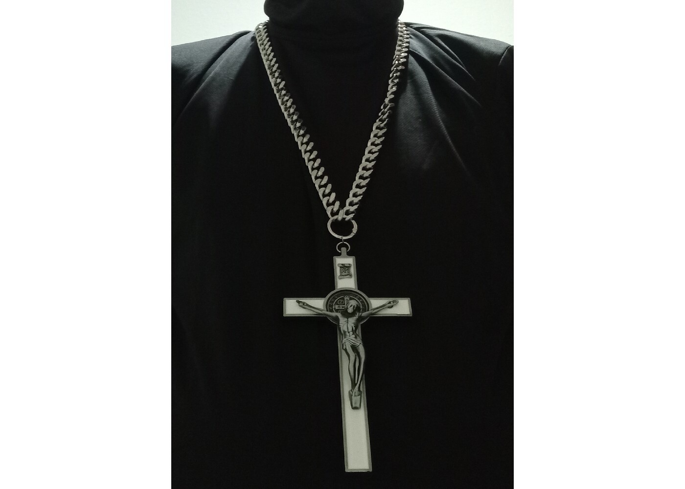 Diese Halskette mit dem sehr großen Kreuz ist sehr prunkvoll elegant und stellt etwas dar. Diese Halskette ist sehr einfach anzuziehen - Einfach überden Kopf ziehen und das prunkvolle Kreuz ausrichten. Ein kleines Armband mit ca.80g ist auch dabei und nicht zu vergessen "Das Zubehör" Ich wünsche ganz viel Spass beim tragen.